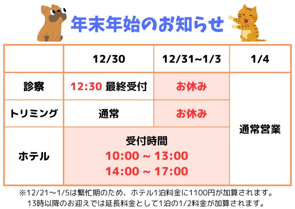 例年通り、12月30日(火)午前中(最終受付12時半)まで診察をおこなっております。 トリミングも30日迄行っておりますが、ご予約の方が多いため長時間のお預かりが難しくなります。 年末の予約はかなり混みあいますので、余裕を持ってのご予約をお願い致します。 ホテル料金は12月21日(日)〜1月5日(月)まで繁忙期料金になりまして、1泊につき+税込1100円頂いております。 あらかじめご了承ください。 13:00以降のお迎えは延長料金(1泊の1/2料金)が追加されます。 その他ご不明な点があれば、お電話にてお尋ね下さい。 病院 03-3771-0075 サロン 03-5728-9112