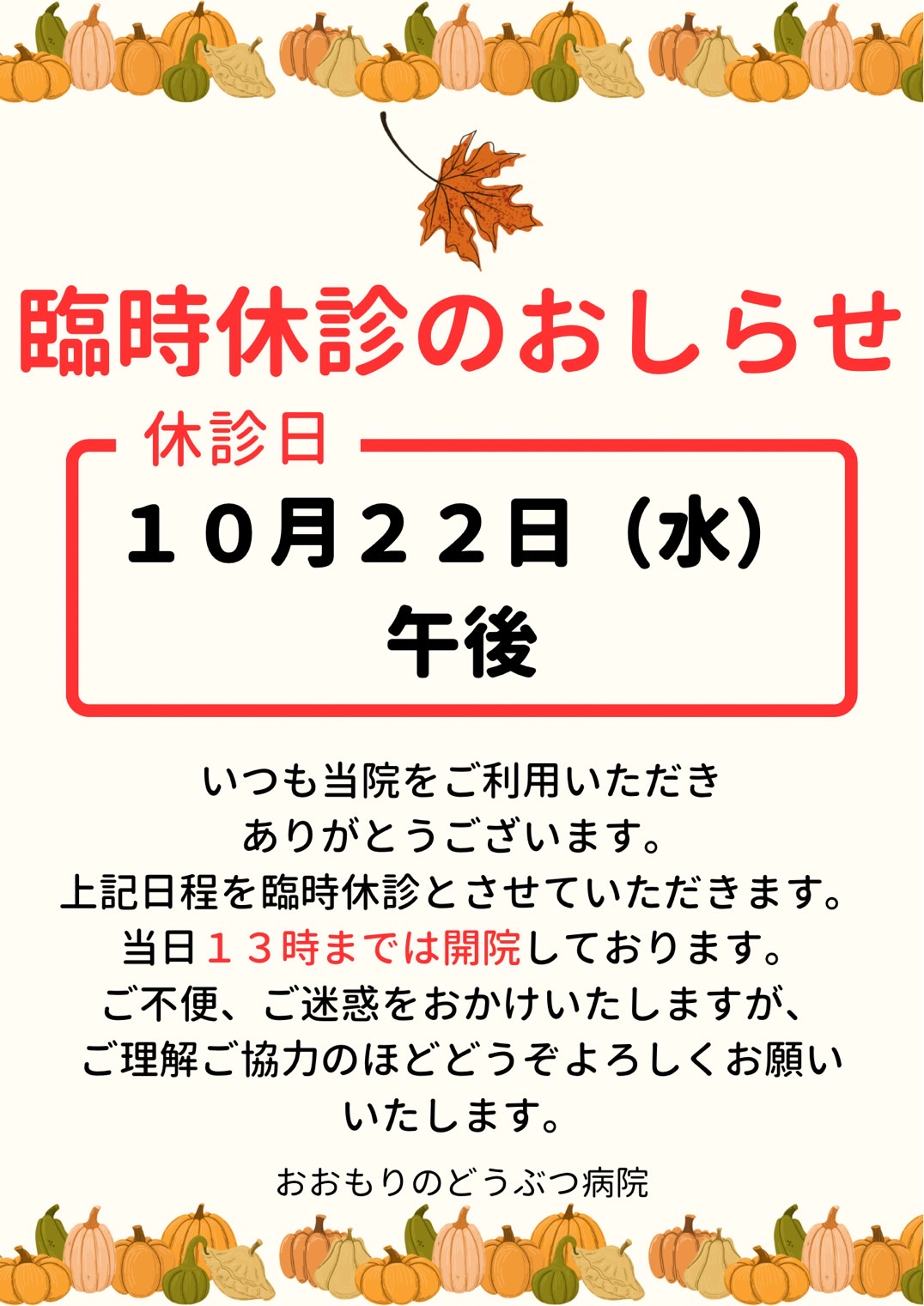 いつも当院をご利用いただきありがとうございます。 10/22(水)午後は臨時休診とさせていただきます。 当日13時までは開院しております。 ご不便、ご迷惑おかけいたしますが、ご理解ご協力のほど、どうぞよろしくお願いいたします。
